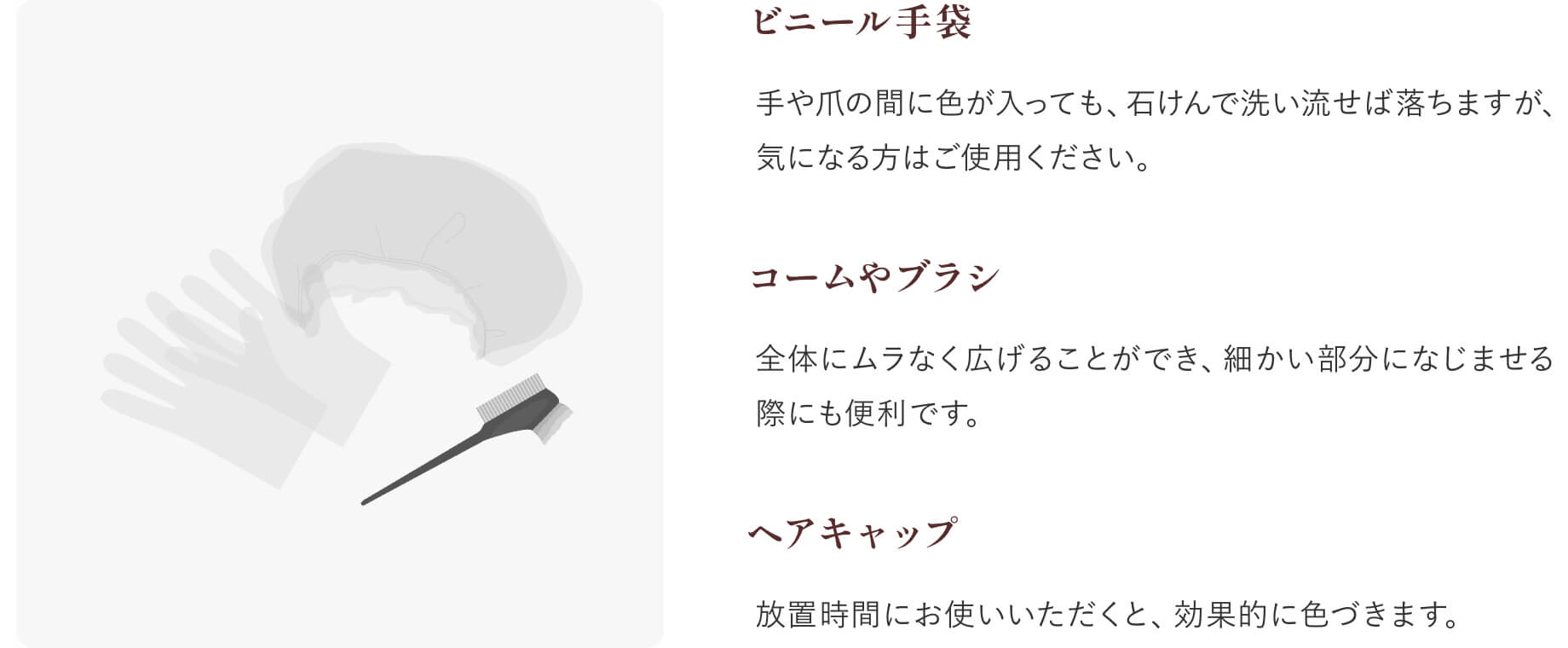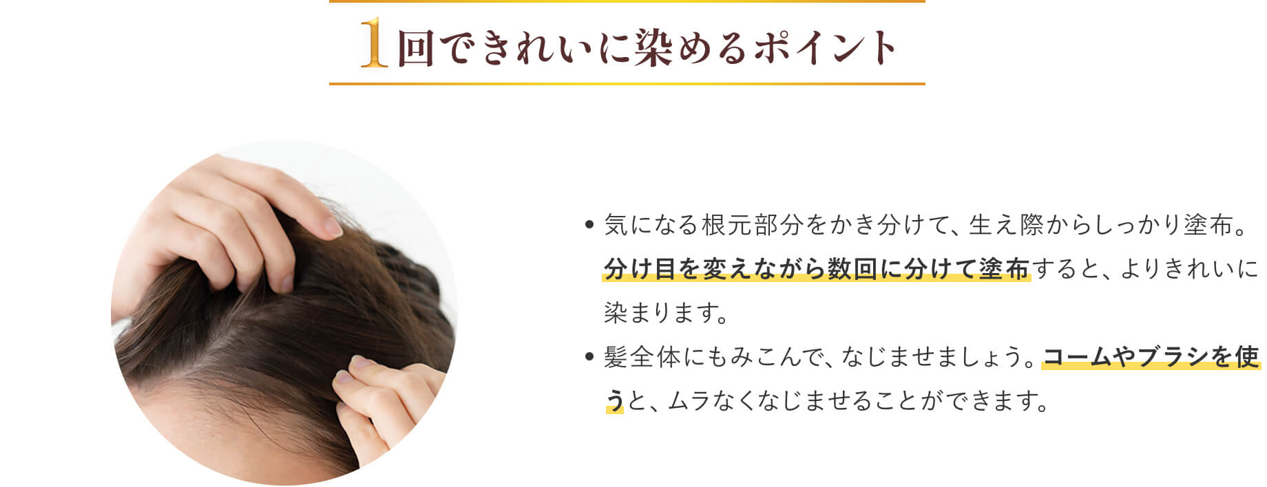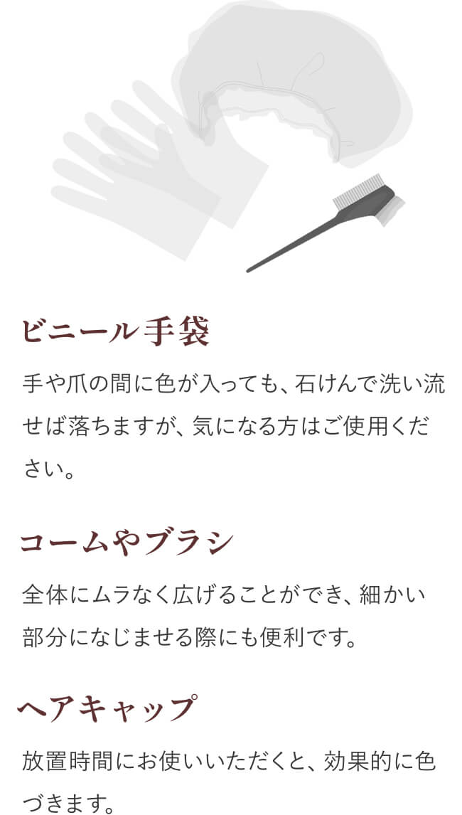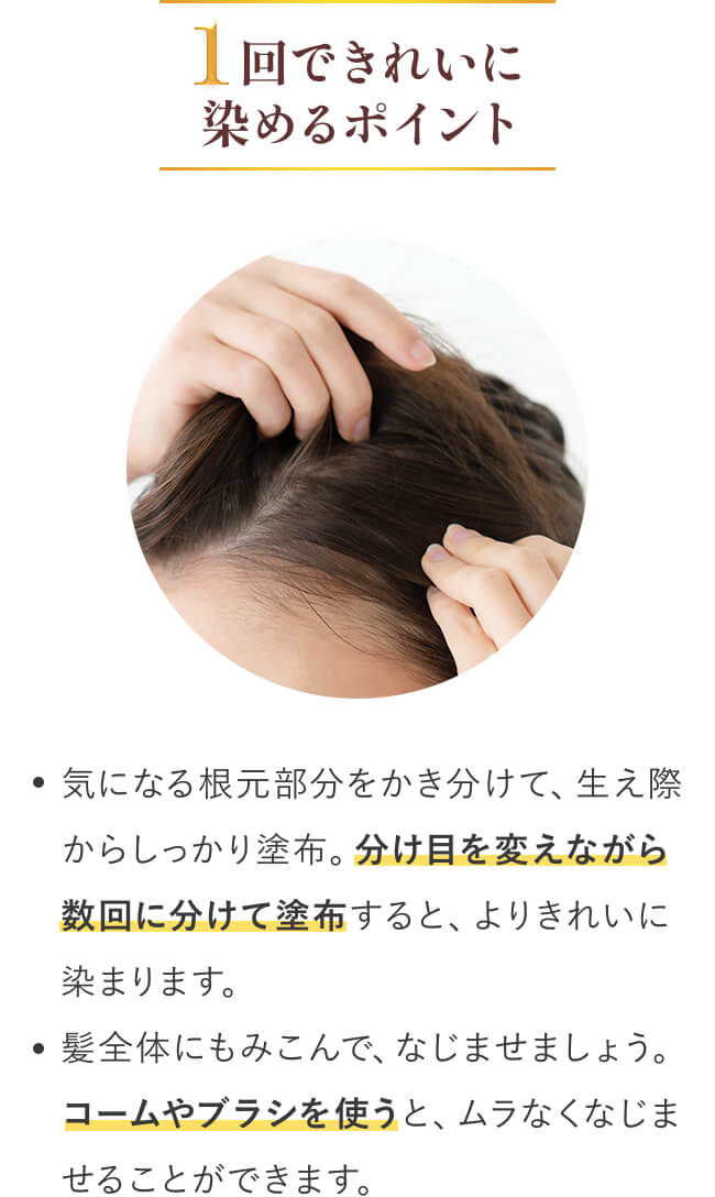 分け目をかえながら、数回に分けて塗布すると、よりきれいに染まります。 整髪料等がついていない状態でお使いください。 手に色がつき、取れにくくなりますので、ビニール手袋のご使用をおすすめします。