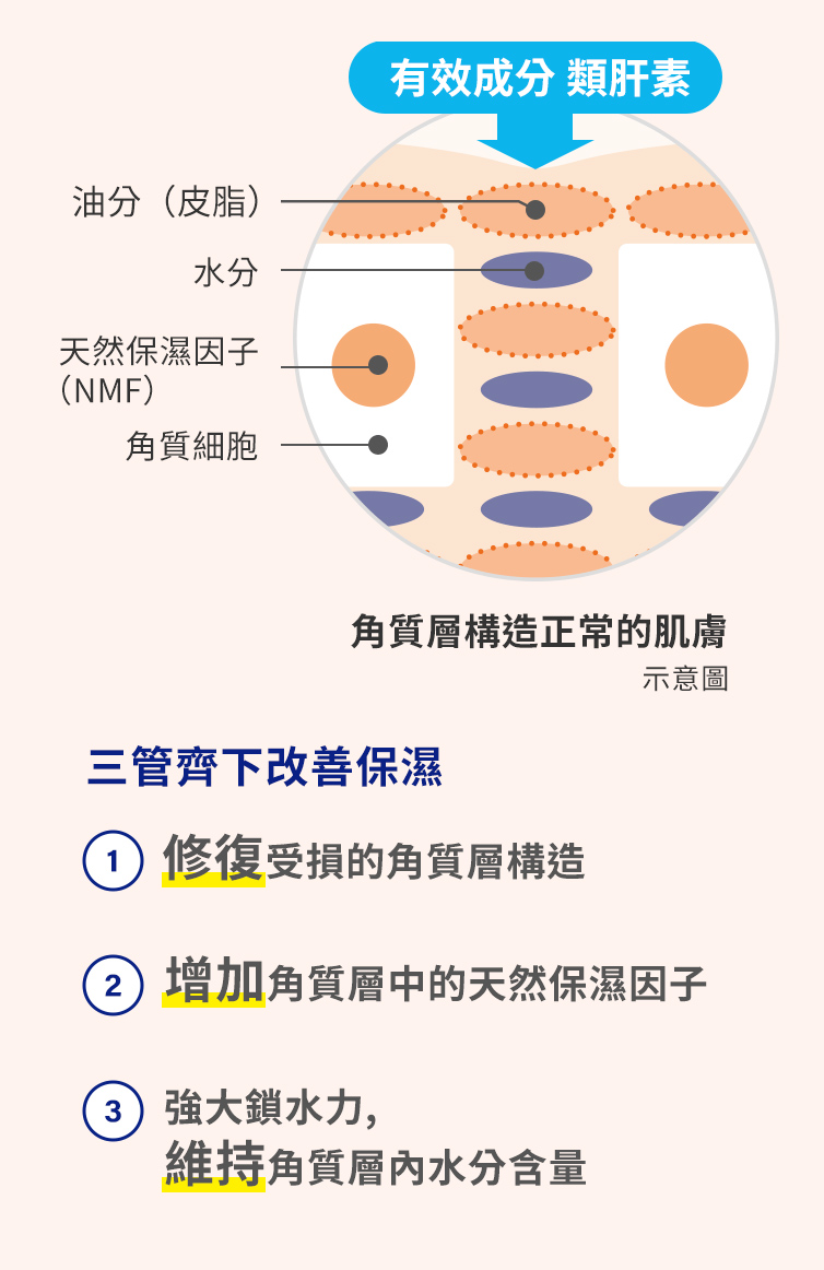 這款治療藥中含有的有效成分類肝素,能夠從3個角度提升皮膚的鎖水保濕能力,從而促進肌膚屏障功能的正常化。