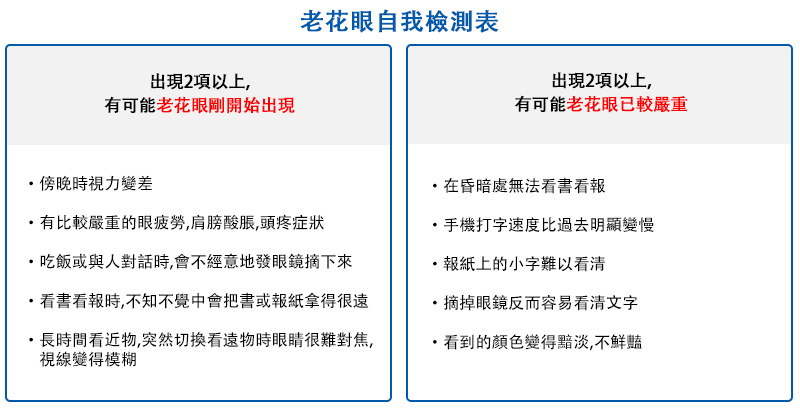 老花眼的進程因人而異,即便是同齡人,每個人的症狀出現時間都不盡相同。如果本來就有近視或遠視,那開始意識到自己是老花眼的時機又會變化。認知自己已經開始出現老花眼,是正確應對老花眼的第一步。