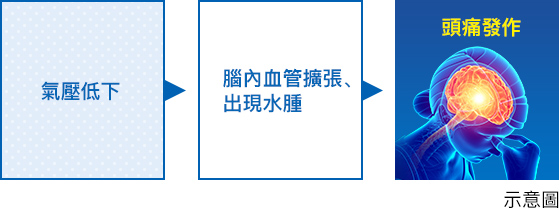 “天氣頭痛”其實也是最近幾年在日本開始被認知的一個症狀。所謂天氣頭痛,是指當氣壓急劇變化或出現低氣壓時,人體內的自律神經、內耳會敏感地察覺到這一氣壓變化,引起腦內的血管擴張和水腫。血管擴張和水腫一旦壓迫到腦神經,就會出現頭痛。