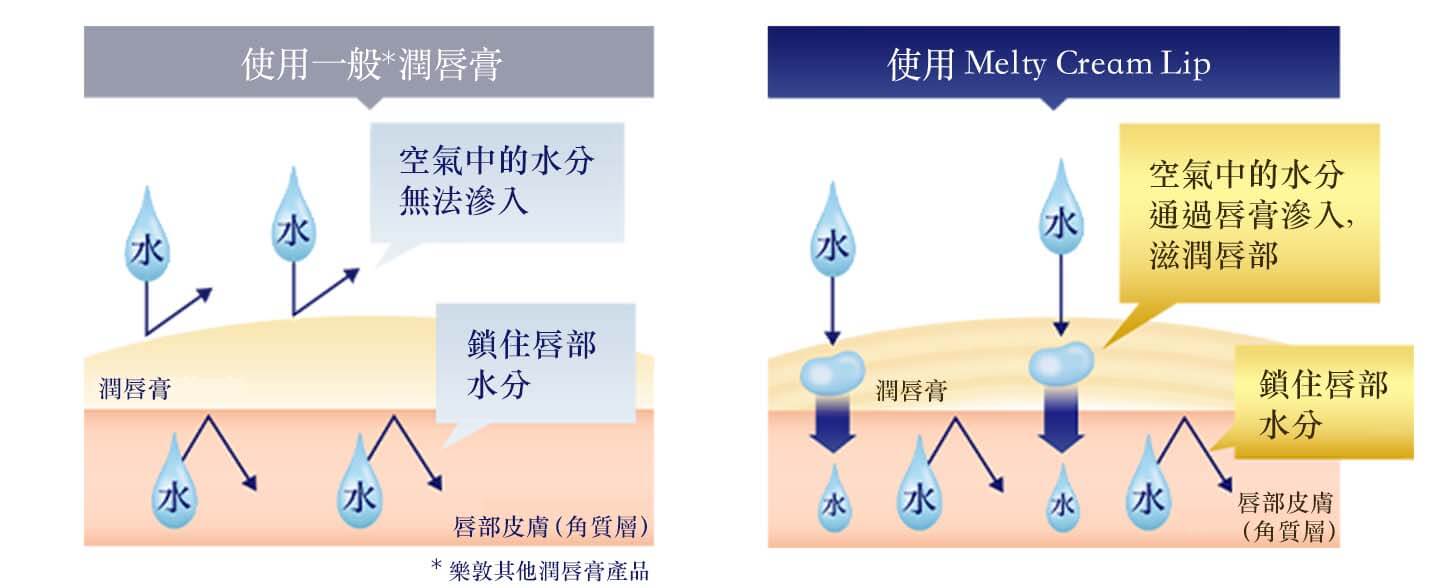 曼秀雷敦Melty Cream Lip中含有多種神經酰胺成分*作為鎖水保濕因子,呵護滋潤柔嫩的唇部肌膚。“水凝潤澤技術”令Melty Cream Lip的保濕力十分持久,無需多次重複塗抹,即可實現長效滋潤。