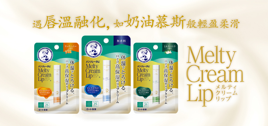 曼秀雷敦Melty Cream Lip是近年來在日本擁有超高人氣的潤唇膏系列。本系列潤唇膏的最大特徵,是在塗抹瞬間,膏體就能隨唇部溫度融化,像奶油慕斯般滋潤覆蓋嘴唇,長效保濕。