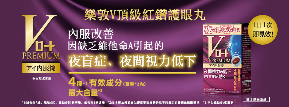 樂敦V頂級紅鑽護眼丸(Vロートナイトプレミアム アイ内服薬)是樂敦製藥針對夜間視力低下、夜盲症問題獨家開發的一款內服護眼藥。4種