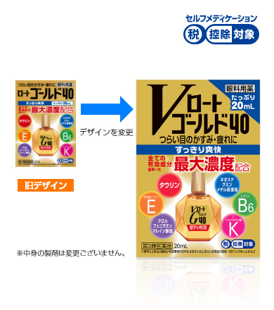 「Vロートゴールド40」は、中高年の目の悩みに着目した目薬です。6種類の有効成分を全て基準