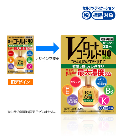 「Vロートゴールド40マイルド」は、中高年の目の悩みに着目した目薬です。6種類の有効成分を全て基準
