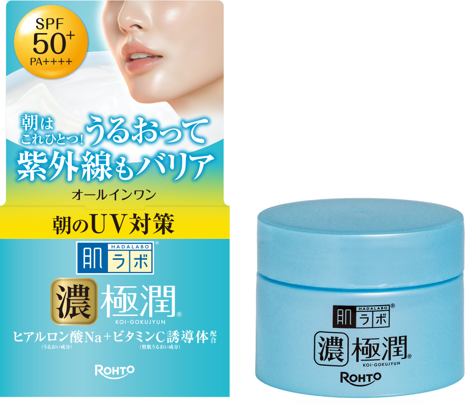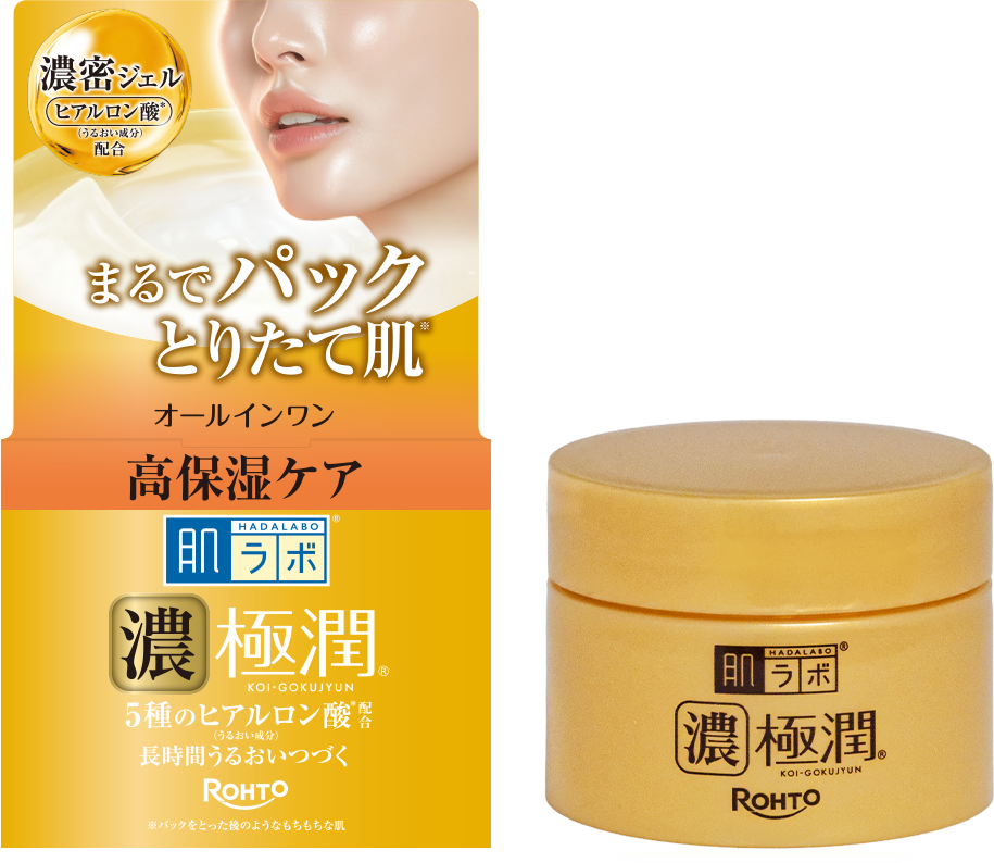 肌ラボ®濃極潤®高保湿オールインワン まるでパックとりたて※1!ぷるんもち肌。※1:ハダラボモイストジェルe (ジェル状保湿液) 5種のヒアルロン酸※2(うるおい成分)+スクワラン・セラミド※3・サクラン®※4(うるおい成分)+長時間・高保湿 ※1 パックをとった後のようなもちもち感 ※2ヒアルロン酸Na、アセチルヒアルロン酸Na、加水分解ヒアルロン酸、グルコシルセラミドヒアルロン酸ヒドロキシプロピルトリモニウム、加水分解ヒアルロン酸アルキル(C12-13)グリセリル(うるおい成分)※3グルコシルセラミド(うるおい成分)※4スイゼンジノリ多糖体(うるおい成分)