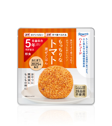 もしもに備えながら定期的に食べきる。心と命を守る循環備蓄食品「ハートフード5年常温保存おにぎり トマト混ぜごはん」は、調理不要(水がいらない)、食器不要(手で食べられる)、5年常温保存、特許製法でつくられた“おにぎり”です。もしもといつもに備える循環備蓄食として、ユーザビリティ(災害時のQOL向上)、ローリングストックしやすさを考えてつくりました。アレルギー物質(特定原材料等)28品目不使用です。