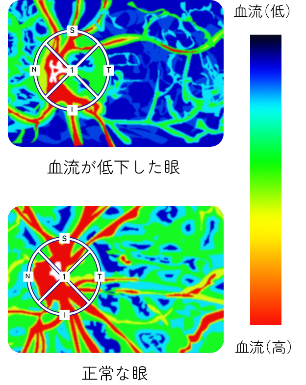 進行した緑内障ほど後眼部の血流が低下していることが報告されています。