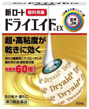 シニア世代のドライアイ(目のかわき)は、涙の分泌量が加齢とともに減少することも原因のひとつです。そんなドライアイの症状に、ロート製薬だから実現した高粘度※5目薬の「ドライエイド」。その「とろみ」が乾いた瞳をベールするように留まって潤いを補給しながら、涙の蒸発まで防ぎます。