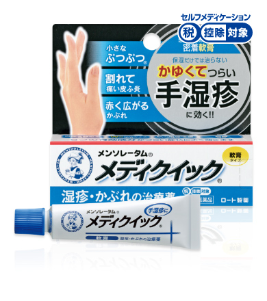 乾燥だけでなく、赤くはれたり炎症で皮がむけたりする手荒れが進行してしまった症状(手湿疹)は、治療が長引きやすい皮フ疾患のひとつです。「メンソレータムメディクイック」は、そのようなつらい手湿疹を改善する治療薬です。