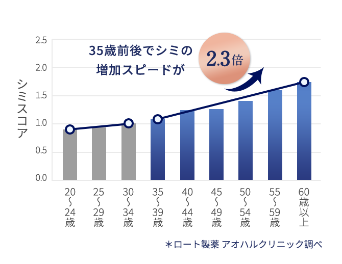 - ※2加速とは、シミスコアを測定し、縦軸をシミスコア、横軸を年齢としたときの傾きの増加こと