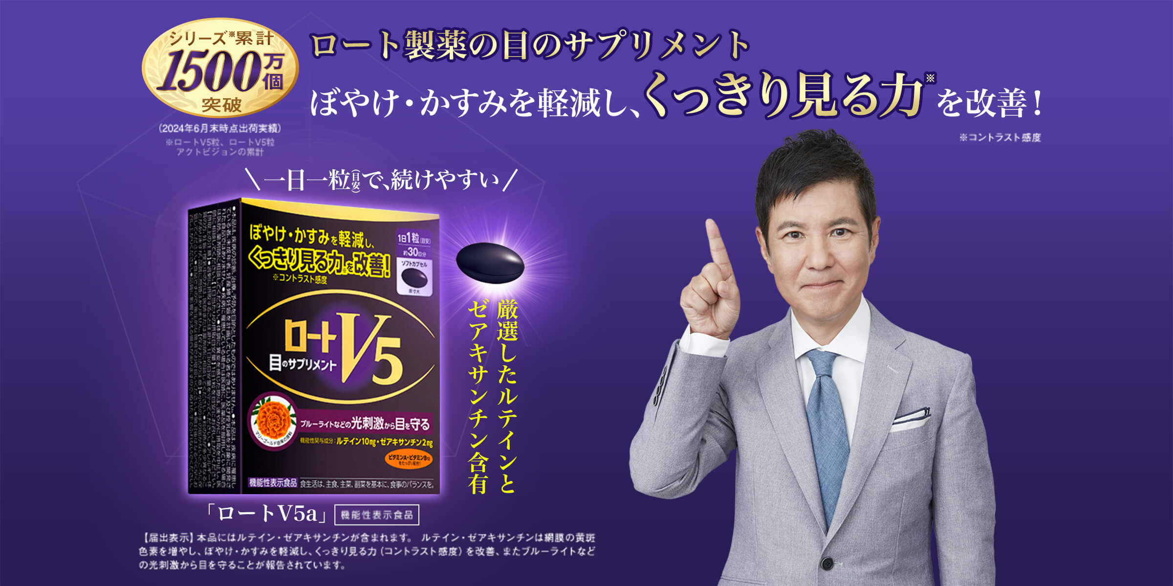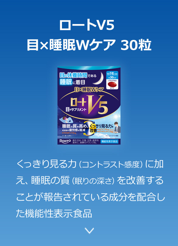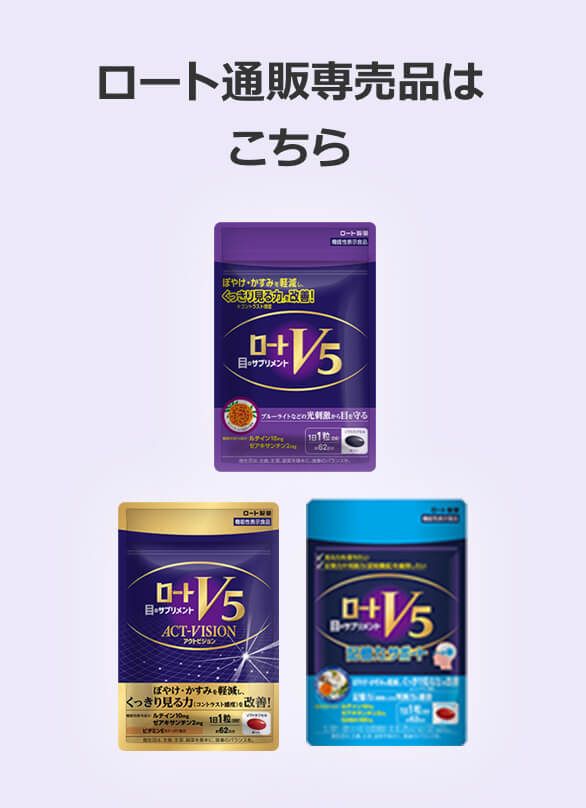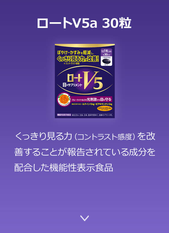 ものを見る力は5つの要素などで支えられています。見る力を維持するためには、日々のバランスのとれた食生活が大切ですが、不足する分はサプリメント等で補うのがおすすめです。ロートV5aはくっきり見る力※1を改善することが報告されている成分ルテイン・ゼアキサンチンを含有します。※1 コントラスト感度