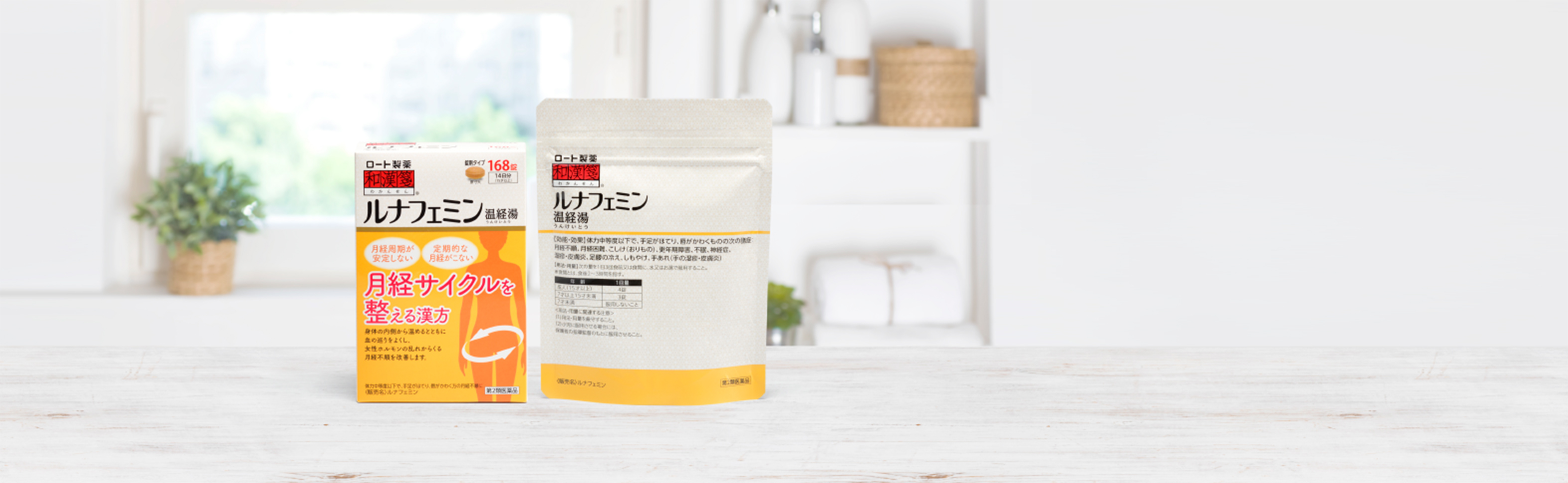 ルナフェミンに含まれる温経湯は、体を内側から温めるゴシュユやショウキョウ、滞った血の巡りを改善するボタンピやセンキュウ、血を補うトウキやシャクヤクなど、12 種類の生薬からなる漢方薬。身体の内側から温めるとともに血の巡りを整え、女性ホルモンの乱れからくる月経不順や月経困難などを改善します。